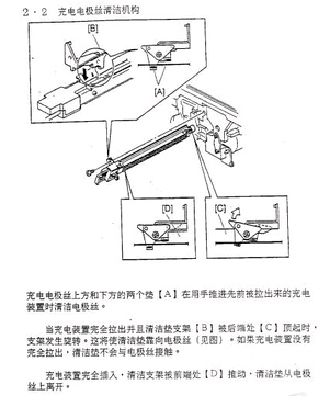 1、復(fù)印機(jī)電極絲被污染和腐蝕是充電裝置的常見故障之一。由于電暈絲被紙灰或墨粉污染,將會嚴(yán)重到影響電暈放電,造成光導(dǎo)體(硒鼓)表面的電位下降,復(fù)印品的質(zhì)量將會隨之受到影響而下降(如圖像淺淡或根本復(fù)印不出圖像 )。在清除電極絲上的污物時應(yīng)注意,不要用砂紙來清潔電極絲(砂紙會將電極絲上的涂層磨掉),不要用有油的手去摸電極絲(油漬會引起在復(fù)印品上出現(xiàn)白條)。清理電極絲時可先用干凈的軟布或脫脂棉沾上清潔劑,清潔屏蔽罩用及電極導(dǎo)軌的內(nèi)部,然后用紙折成較厚的紙折,用手捏住紙折夾住電極絲從一端拉向另一端,不要中途停頓,否則會有紙屑積留下來,這也是造成故障的原因。如此擦抹3~4次即可(圖3-11)。如無法清理的電極絲就要更換掉。要從根本上解決電極絲污染的問題,只是清理或更換電極絲不能解決根本問題,而是應(yīng)從解決漏粉現(xiàn)象入手,只有從根本上解決漏粉以及其它原因造成的粉塵飛揚(yáng),才能保證電極絲不被污染或少受污染。