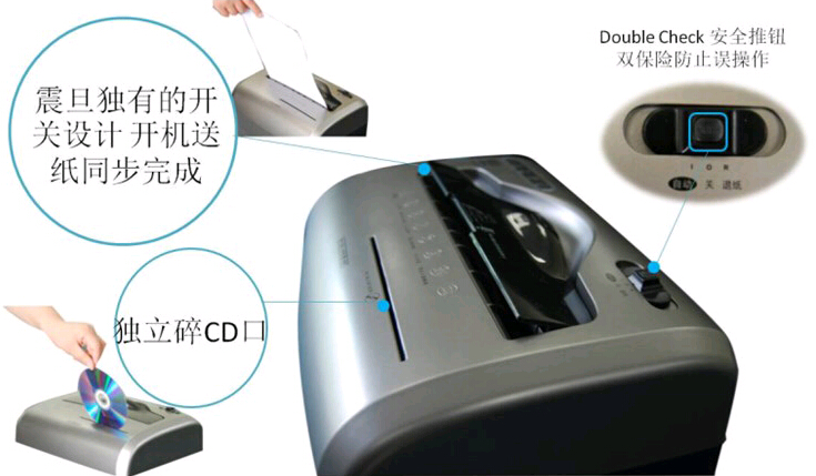震旦獨有的開關設計,開機送紙同步完成,獨立的碎CD入口保證了碎紙的刀片不受損傷